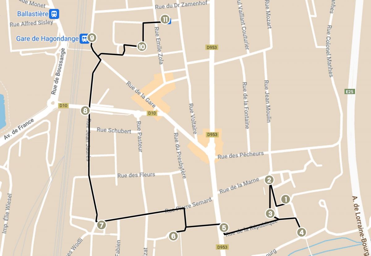 Cet itinéraire a pour thème de vous faire connaître les rues, les maisons, le patrimoine historique et l'histoire de la ville de Hagondange.